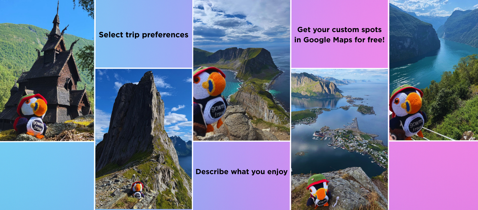 Through the Trip Planner, you share your preferences: fjords, road trips, hikes, waterfalls, calmer days, photo spots, budget focus, etc. - We connect you to relevant places